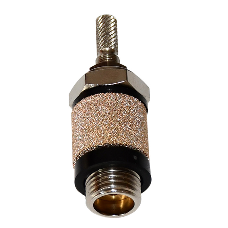 Frein/Silencieux d'échappement en bronze fritté du G1/8" au G3/8". Régle le débit d'air par rotation de la molette et atténue le bruit.